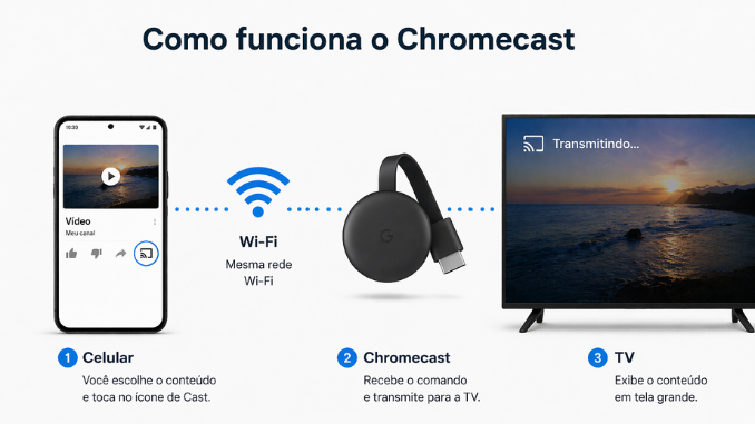 Na prática, o Chromecast se conecta à TV e recebe conteúdos enviados de outros dispositivos. Isso significa que você pode assistir vídeos do YouTube, séries da Netflix ou até espelhar a tela do celular diretamente na TV, mesmo que ela não tenha essas funções de fábrica.