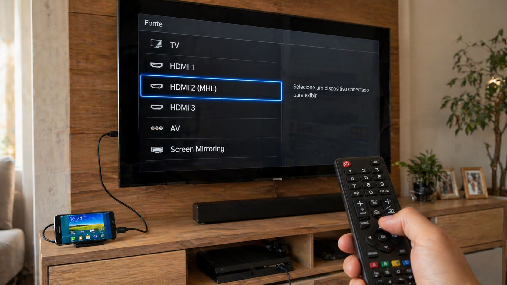 Ao conectar tudo, a TV deve reconhecer automaticamente o sinal, como faria com qualquer outro dispositivo HDMI. Basta selecionar a entrada correta usando o controle remoto. Em poucos segundos, a tela do seu celular será espelhada na TV, sem configurações complexas ou aplicativos adicionais.
