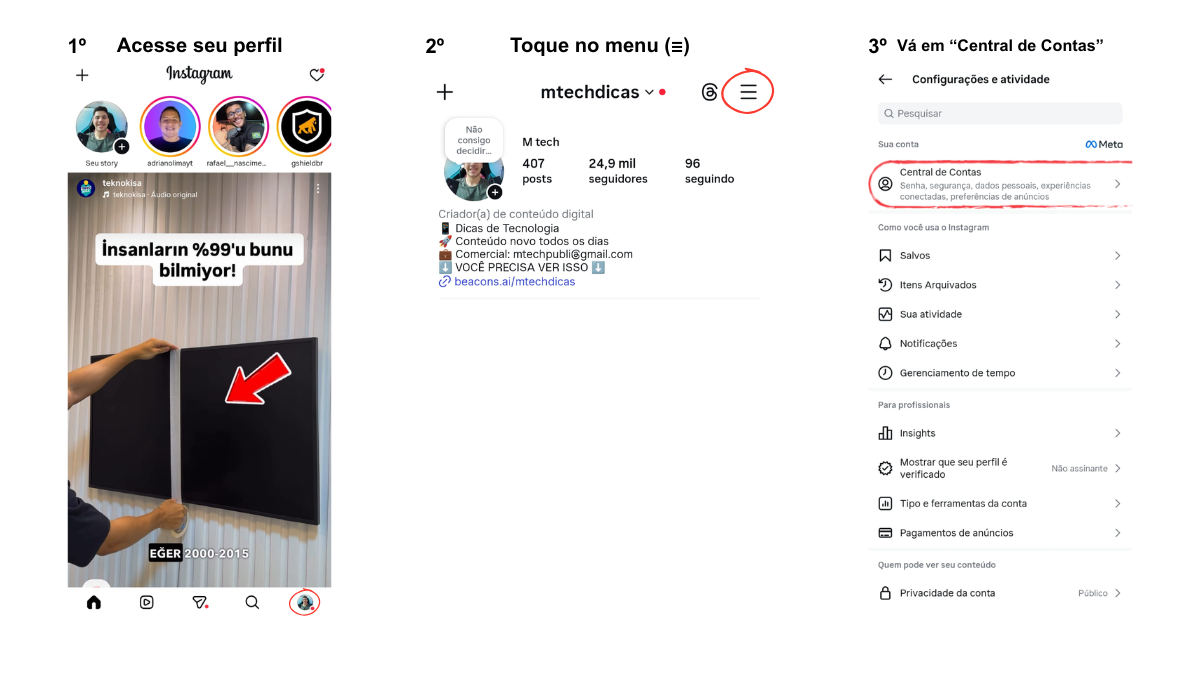 Após abrir o menu, clique em “Configurações”. Em seguida, localize a seção “Central de Contas” e acesse essa área.