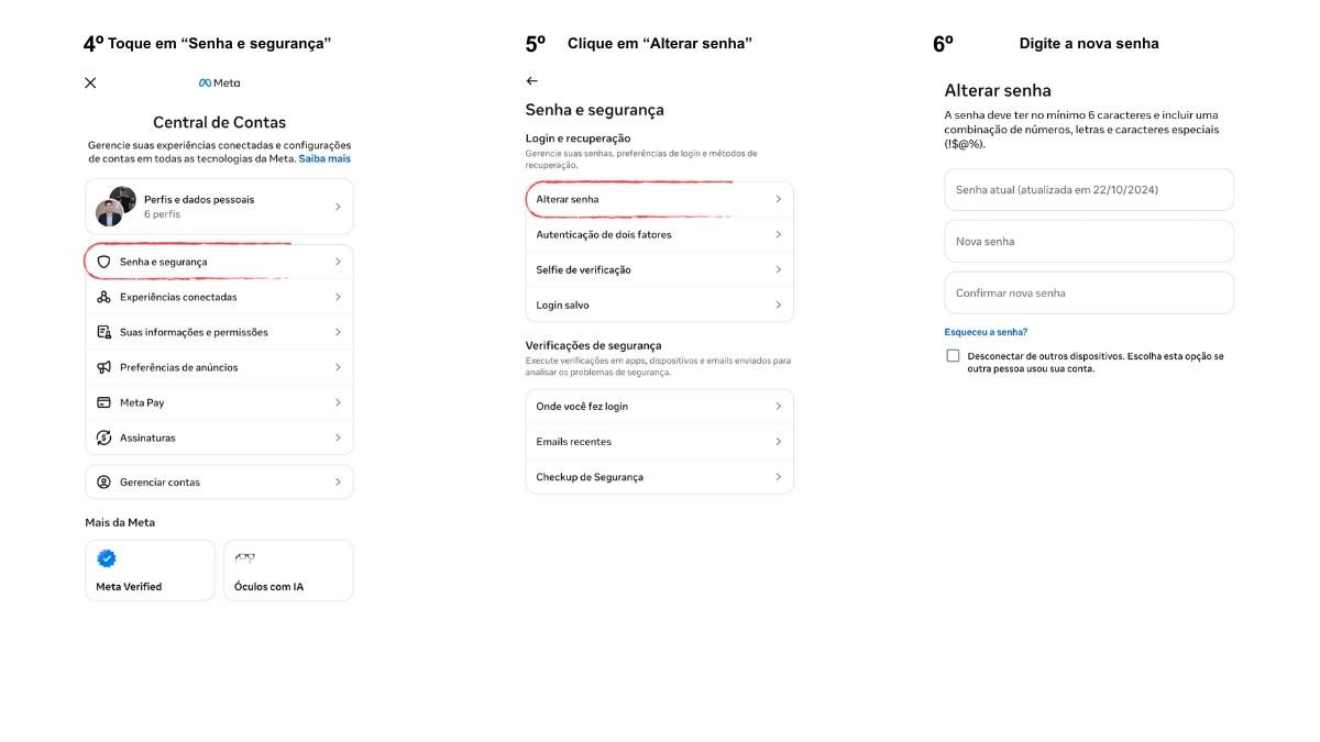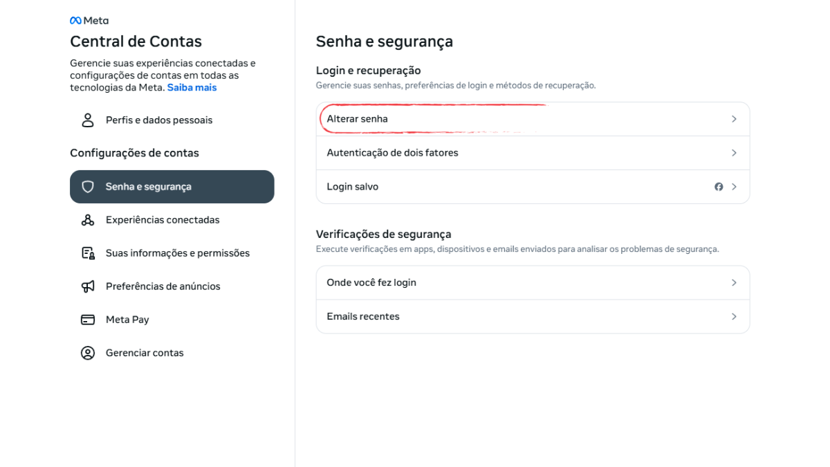 Dentro da Central de Contas, toque na opção “Senha e segurança”. Em seguida, selecione “Alterar senha”. O sistema solicitará que você informe sua senha atual e, logo depois, permitirá que você crie uma nova senha.