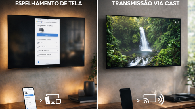 Uma dúvida comum é a diferença entre espelhamento de tela e transmissão via Google Home. Embora pareçam a mesma coisa, tecnicamente são bem diferentes — e isso impacta diretamente na sua experiência.