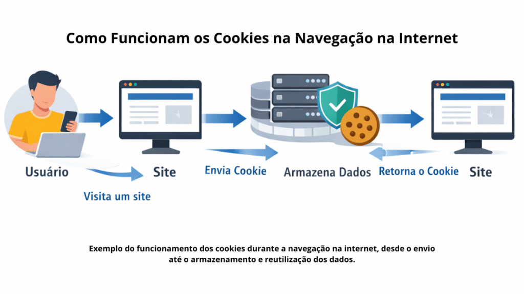 O funcionamento dos cookies é automático e ocorre sempre que você interage com um site. Ao acessar uma página, o servidor envia um pequeno arquivo ao navegador, que o armazena localmente no dispositivo.
